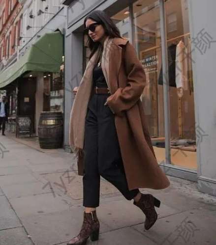 黑色圍巾是駝色大衣的經(jīng)典搭配之一。黑色作為一種百搭的顏色,能夠與任何顏色的服裝搭配。駝色大衣與黑色圍巾的搭配,既顯沉穩(wěn)又大氣,適合各種場合。如果你想要在視覺上更加顯瘦,可以選擇黑色細條紋圍巾,它能在一定程度上修飾你的身材線條。