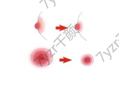 乳暈縮小時(shí),以乳頭為中心畫一個(gè)圓(一般1.5-2.5cm),半徑適當(dāng)。所以要保留層和皮下血管網(wǎng),防止乳頭、乳暈供血不足。沿橫徑方向在外層內(nèi)外剪開一個(gè)三角形的皮,以減小半徑,使之與新乳暈半徑一致。后在皮下輕微游離外環(huán),然后縫合。