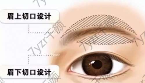 提眉手術(shù)的切口,一般設(shè)計在這兩個位置:眉毛上緣和眉毛下緣,各位求美者做眉下切口的人比較多,原因很簡單:位置隱蔽,不容易被人看到。