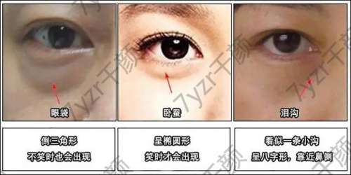 2.顯現(xiàn):眼袋時(shí)刻存在,而臥蠶多數(shù)在笑的時(shí)候才更。