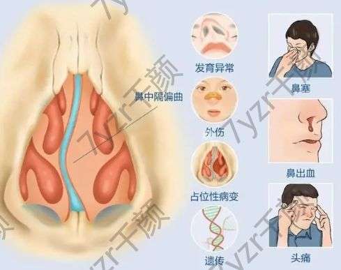 是本病的主要原因之一。鼻中隔在胚胎階段由幾塊軟骨組成。在發(fā)育、生長和骨化過程中,如果骨與軟骨發(fā)育不平衡或骨與骨生長不平衡,就會形成畸形或偏差;關(guān)節(jié)處形成骨刺或骨脊。常見的原因是腺樣體肥大導(dǎo)致長期用口呼吸。久而久之,硬腭弓變高,上下鼻腔距離縮短,鼻中隔發(fā)育受到限制,導(dǎo)致鼻中隔偏曲。營養(yǎng)不良影響鼻中隔的發(fā)育和骨化,也可引起鼻中隔偏曲。。